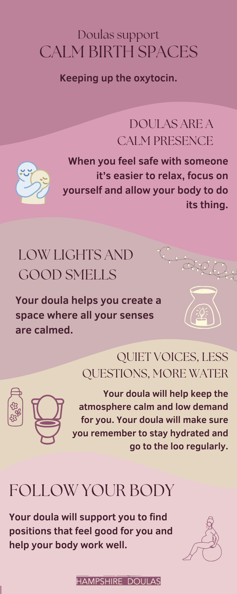 One of the most important things for increasing the levels of oxytocin we produce while birthing is to keep the lights low. Bright lights can make us too aware of our surroundings and the possibility of being observed which can stimulate the production of adrenalin -oxytocin’s natural enemy. Even when we’re at a birth without our bag we will help you to find a nice quiet spot to labour with low lights. The added benefit of the tea lights or fairy lights is they have a soft comforting light that we naturally associate with warm cosy evenings with our loved ones which helps women feel safe and produce more of the lovely oxytocin.