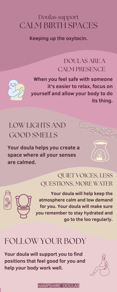 Sometimes it can be a challenge, especially in our society where we find speed and measurement are so often expected to be a feature in birth experiences and where we often birth in unfamiliar surroundings, to reach that place of being totally in the zone and able to find the power in us to follow what our body is doing. The calm relaxing presence of a doula by your side is their main tool in helping you reach that place of feeling safe and relaxing into what your body is doing and letting it take over and get birth done. Your doula’s reassurance and ability to help those around you respect and honour your need for that calm quiet zone is their main tool and you can’t keep that in a bag.