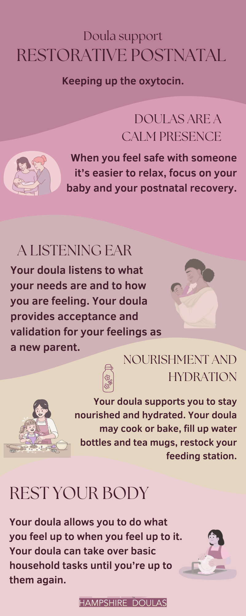 Mostly doulas encourage the parents to hold the baby while the doula makes the tea or sorts the washing etc. But sometimes you will want to do something without holding your baby like go to the loo or have a shower or take a nap. If you’ve got a baby who cries when you put them down then you might be feeling too tense to enjoy those things so having an experienced person you can trust to care for your baby and keep them quietly happy while you take care of yourself can make all the difference to your mental and physical well being.